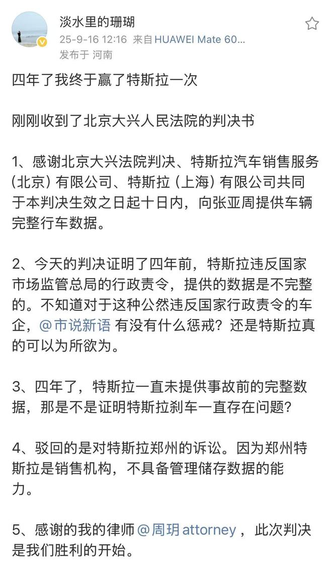维权女车主胜诉特斯拉,要求提供完整行车数据