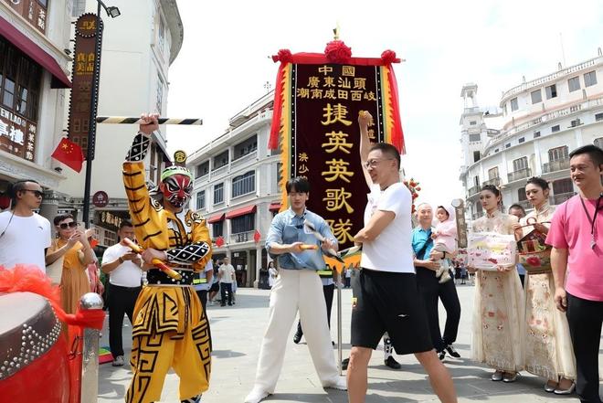 上午10点,张朝阳的潮汕文化之旅从汕头历史文化地标“小公园”开启。中山纪念亭旁,一支英歌队上演气势磅礴的表演,源自《水浒传》的刚劲舞姿吸引了张朝阳的目光。他全程沉浸观看,还向队员学习转槌动作,亲身体验这一非遗项目的豪迈活力。