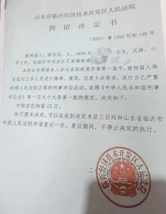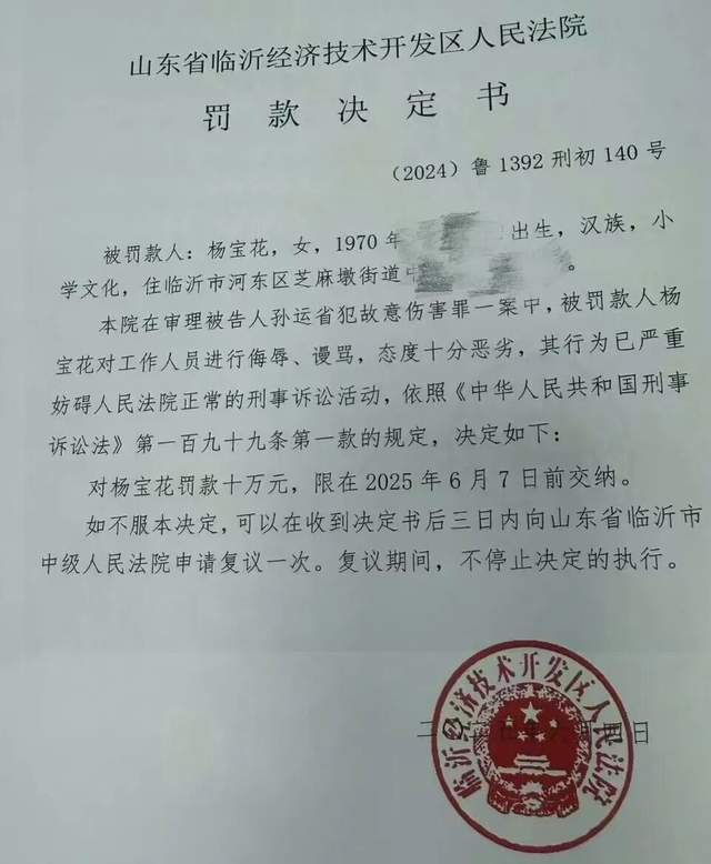 最终,临沂经开区法院决定,对杨宝花罚款10万元,同时对其拘留15日。