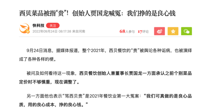 西贝第三个错误是总想教育大众什么是贵什么不贵。