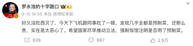 本来罗永浩发的微博也没啥人看到,而且说实话这事儿最开始是罗永浩不占理的。他在不知道西贝有没有用预制菜的情况下直接发了那么一条微博,这事儿你要真较真儿的话,法理上西贝完全可以说按照规定我这不算预制菜,然后罗永浩还用到了“恶心”这样的字眼,真去打官司的话罗永浩真可能会输。