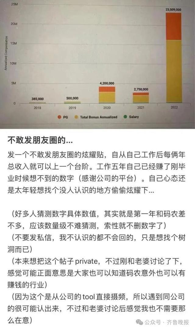 吴舰2023年曾在社交平台“悄悄炫富”,并称“不敢发朋友圈,自己心态还是太年轻,想找个没人认识的地方偷偷炫耀下......”。该帖子显示,其2022年的薪资相较往年出现暴涨,高达2350万美元。