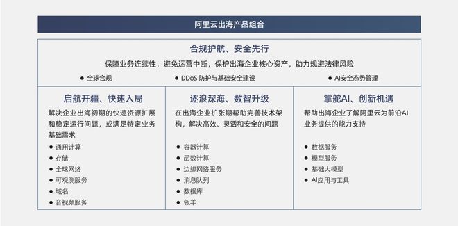 基于十几年出海积累的大量实践经验,阿里云总结了满足中国企业出海不同阶段业务发展的技术需求和对应的产品组合。