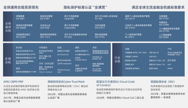 作为全球安全合规水平领先的云服务商,阿里云通过了 150 多项安全合规认证,为客户提供符合国际公认标准的云环境。面对不同国家严苛的数据保护法规、行业准入准则,阿里云构建起一套完善且严密的合规体系,从数据的收集、存储、传输到处理,全方位保障企业数据资产安全,让出海企业无后顾之忧。
