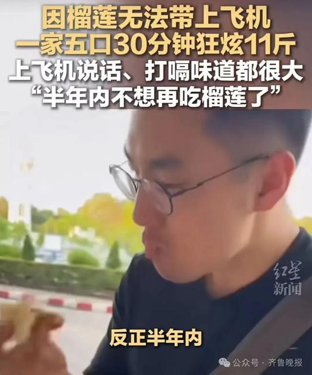 一家五口因携带过多榴莲无法登机,愤怒之下在30分钟内吃掉了11斤榴莲,随后登机后整个机舱弥漫榴莲味引发打嗝,当事人表示这是半年内最不想再次尝试的经历,提醒人们要遵守航空规定,避免类似尴尬情况发生。