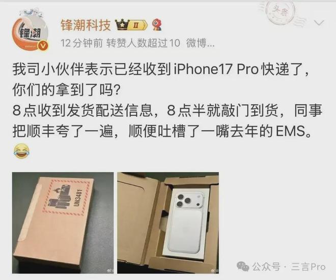 今日,苹果iPhone17系列正式开售,首批预购用户已经收到快递,不少网友晒图。