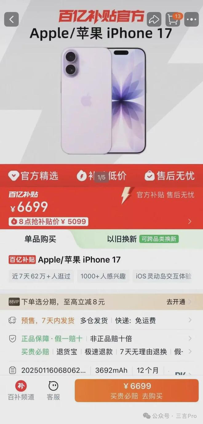 和前几天预购一样,iPhone17线上一上架,各大平台就被抢购一空。今天正式开售,不到一分钟全网基本无货了。