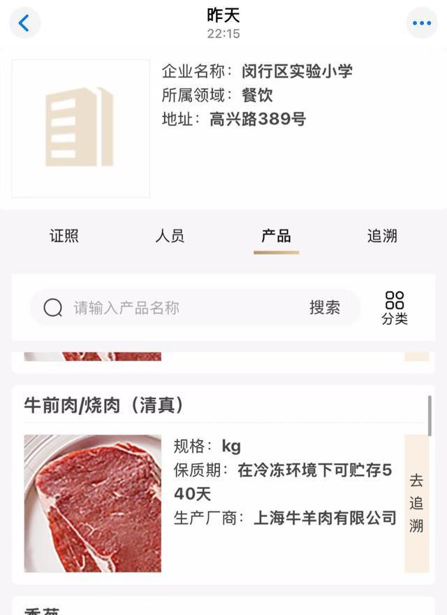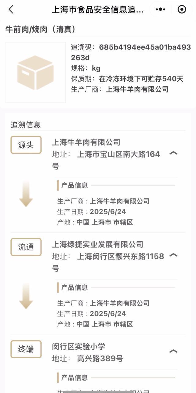 当晚,记者通过上海市食品安全信息追溯平台进行了搜索。以闵行区实验小学进购的一款“牛前肉/牛后肉”为例,该肉品的生产厂商为上海牛羊肉有限公司,保质期为在冷冻环境下可贮存540天。溯源详情信息显示,该产品由上海牛羊肉有限公司、上海绿捷公司流通,最终出货至闵行区实验小学。