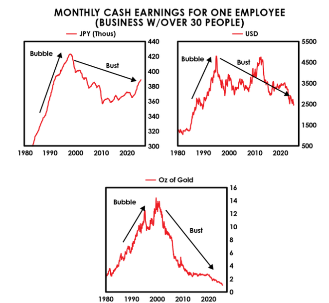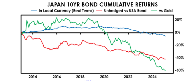 最后是资产。自2013年以来,日本政府的债券持有者相对于持有美元债务损失了45%,相对于持有黄金损失了60%。