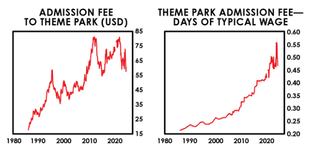 首先是消费。日本主题公园的门票,在2000年大约相当于0.25天的工作收入,在2024年相当于0.5天。