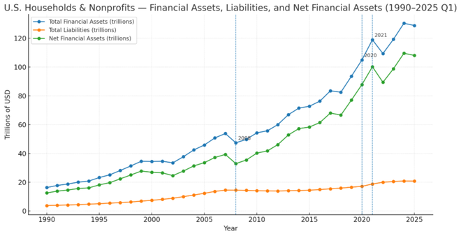 2008年之后,美国家庭金融资产(即“纸面财富”)名义价值开始进入快速增长通道,从32万亿美元增至2024年的109万亿美元,增长了233%,而同期GDP仅增长98%。