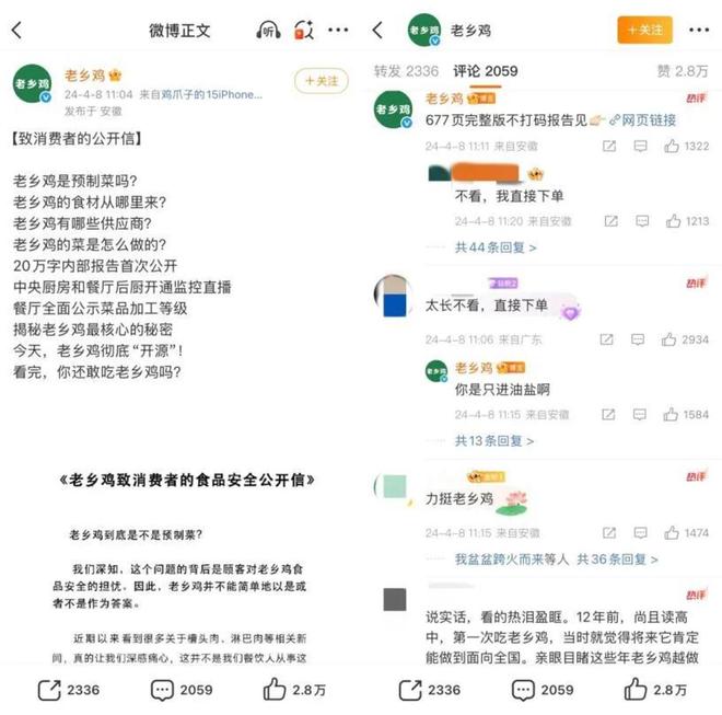2024年面对预制菜的舆论风波时,老乡鸡迅速通过官博发布了长达677页、超20万字的全溯源报告,并将报告置顶展示至今。所有看到这份详实材料的用户,都能直观感受到品牌对“透明”与“诚信”的坚持。