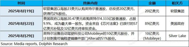 来看一下,自 8 月以来,英特尔进行了一系列的操作,其中分别引入了软银、美国政府和英伟达成为公司股东,并出售了 Mobileye 的股份。