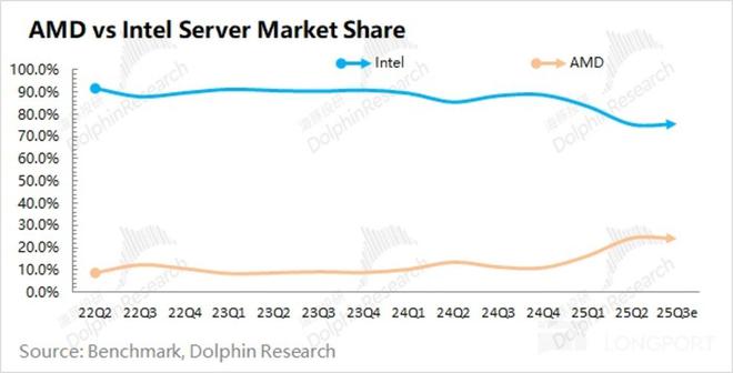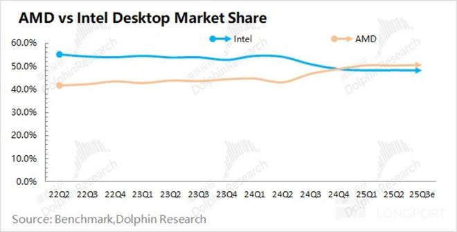 英特尔在 PC 市场也受到 AMD 的明显冲击,尤其是在桌面级 CPU 市场中,AMD 的市场份额已经实现了对英特尔的反超。