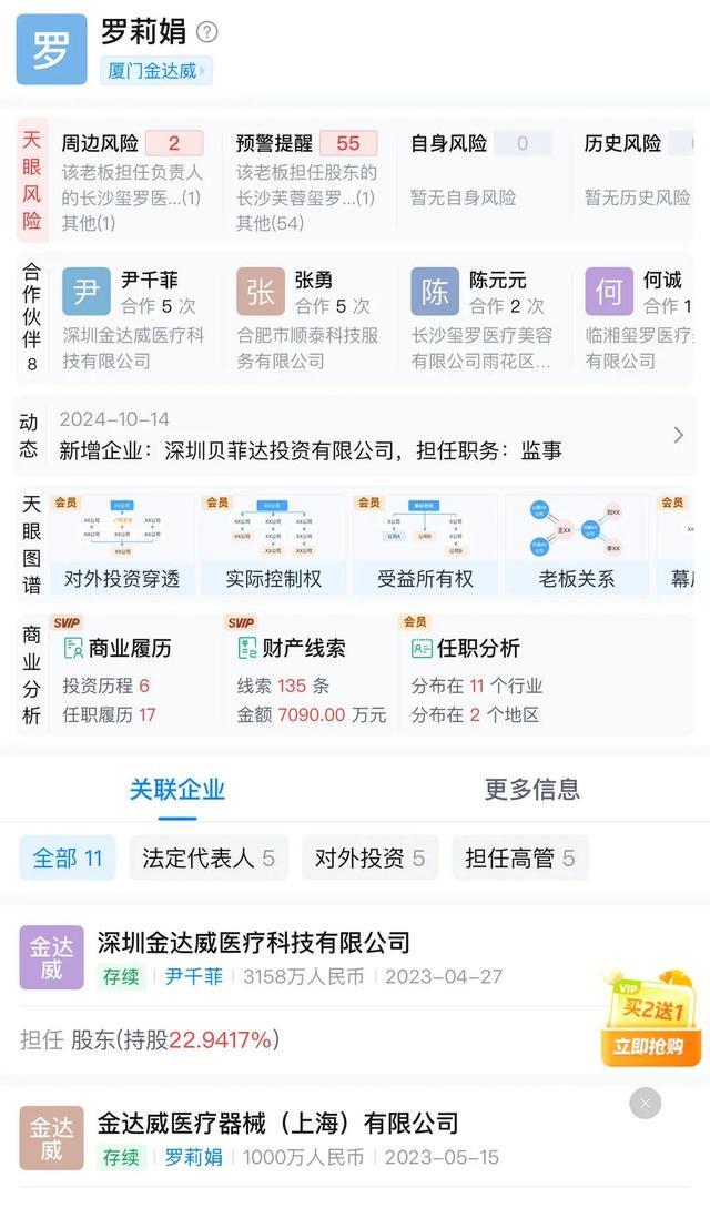 天眼查显示,长沙玺罗医疗美容有限公司法定代表人陈元元,大股东为罗莉娟,持股90%,企业注册资本200万元。
