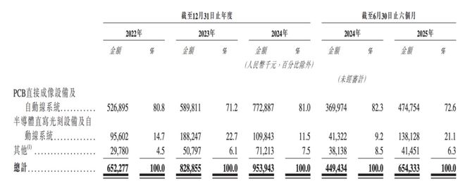 PCB业务是芯碁微装的核心业务,在2022年、2023年、2024年及2025年上半年(以下简称“报告期”),营收占比分别为80.8%、71.2%、81%及72.6%。