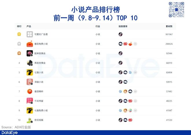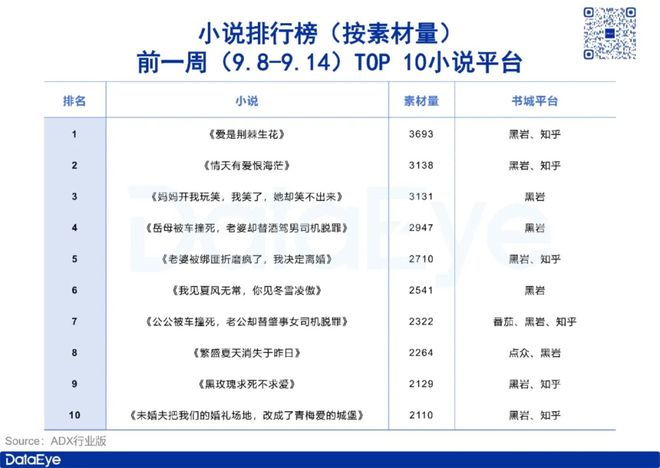 在平台分布上,ADX行业版数据显示,前一周(9.8-9.14)小说排行榜(按素材量排序)TOP 10小说书城方包含黑岩、知乎、番茄和点众。其中,10部小说平台均包含黑岩,黑岩占比100%,其次是知乎占比60%。