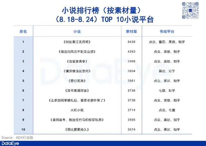 ADX行业版数据显示,四周前(8.18-8.24)ADX小说排行榜(按素材数排序)TOP 10中,男频、女频小说各5部。其中榜首《何处春江无月明》为女频古言题材,素材量5436组,第二名《海边的风吹不到雪山顶》为男频都市题材,素材量4263组,第三名《当爱意凋零》为女频现言题材,素材量3988组。