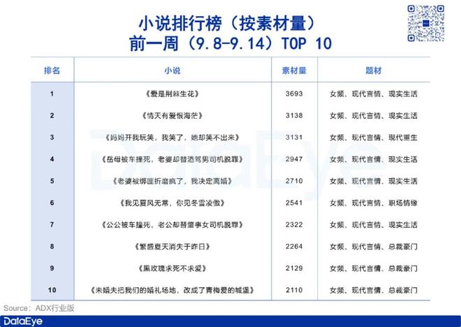 ADX行业版数据显示,前一周(9.8-9.14)小说排行榜(按素材量排序)前十名均为女频言情小说,占比100%,类型涵盖现实生活、现代重生、职场情缘和总裁豪门。