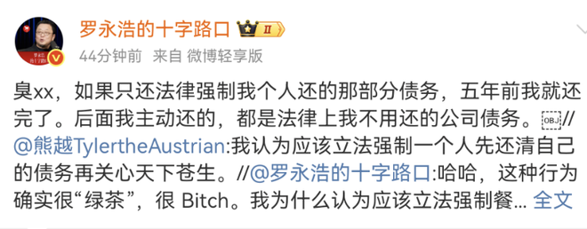 9月22日,罗永浩针对债务问题发声。他表示如果仅还法律强制其个人偿还的债务,五年前就已还完。后续主动偿还的均为法律上无需其偿还的公司债务。