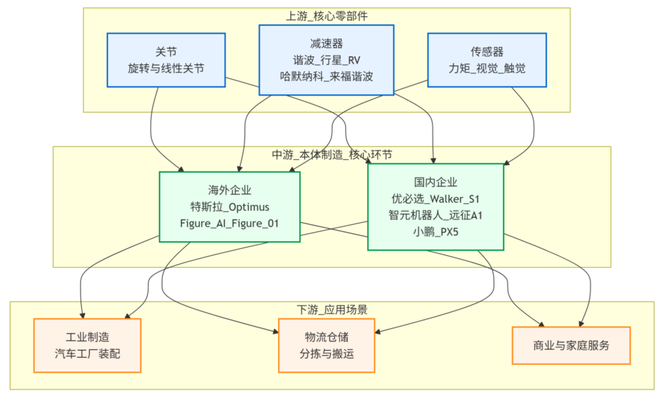 人形机器人产业链可划分为上游核心零部件、中游本体制造和下游场景应用三大环节。