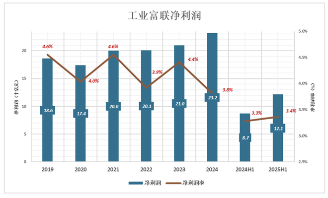 2025年H1,工业富联净利润121亿、利润率3.4%。