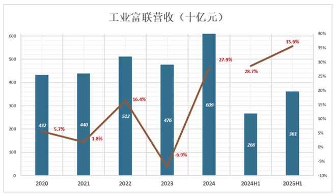 2025年Q2,工业富联营收2003.5亿、同比增长35.9%,净利润69亿、同比增长51.6%;二季度鸿海精密净利润97.5亿、同比增长27%;