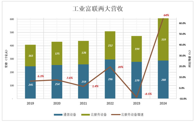 2024年,通信设备对营收增长的贡献率仅为6.7%;云服务设备贡献率达94.2%;工业互联网收入同比下降42.9%(2023年同比下降13.9%)。