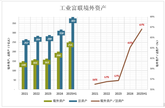 2021年末、2022年末、2023年末,工业富联境外资产分别为1494亿、1606亿、1632亿,约为总资产的60%、净资产的120%。 2024年末,境外资产突破2000亿,占总资产的63.1%,相当于净资产的131%。 2025年6月末,境外资产进一步增至2552亿、占总资产的66.6%,暴涨至净资产的168%!