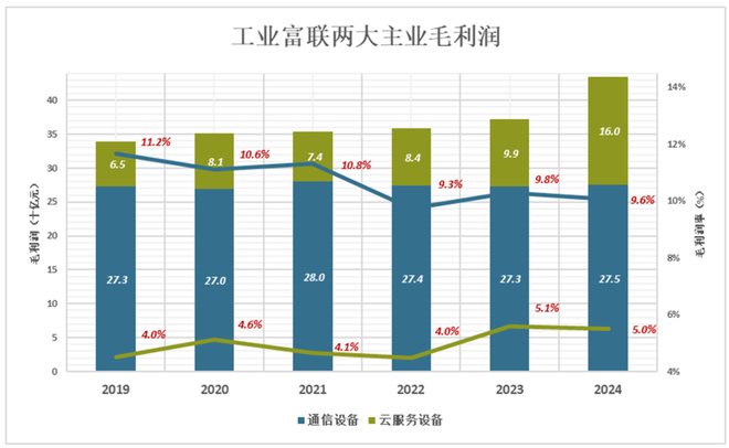 工业富联这毛利润率在代工厂中都算低的。2024年立讯精密“通讯互联产品及精密组件”业务毛利润率16.4%,“消费电子”业务毛利润率9.1%。