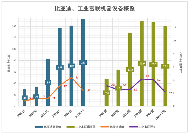 截至2025年6月末,比亚迪固定资金相当于总资产的33.2%;工业富联固定资产仅为总资产的5.9%。