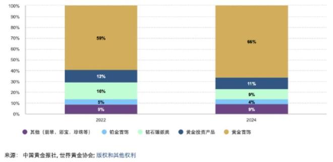 据世界黄金协会数据,各类珠宝对零售额的贡献占比变化中,钻石镶嵌类从2022年7月的16%降至2024年7月的9%,黄金首饰则从59%增加至66%。