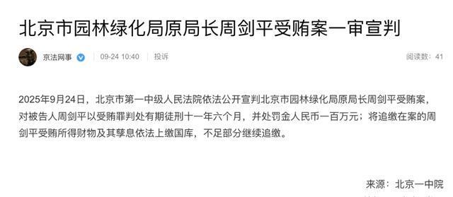 据京法网事,2025年9月24日,北京市第一中级人民法院依法公开宣判北京市园林绿化局原局长周剑平受贿案,对被告人周剑平以受贿罪判处有期徒刑十一年六个月,并处罚金人民币一百万元;将追缴在案的周剑平受贿所得财物及其孳息依法上缴国库,不足部分继续追缴。
