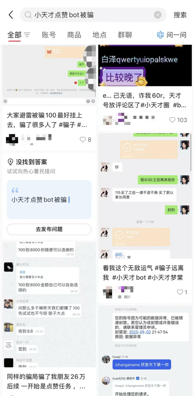 可这样的“避雷”,真的有用吗?在他发帖之前,小红书上搜索“小天才点赞bot被骗”,早有成千上百条的类似内容。可新的受骗者,仍然一个接一个地出现。