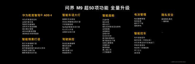 更明显的优势在智能化上。问界M9升级华为乾崑智驾ADS 4,新增华为手表遥控泊车、泊车车外语音提醒、远程代客充电等功能,持续强化泊车、充电的安全性与便利性。
