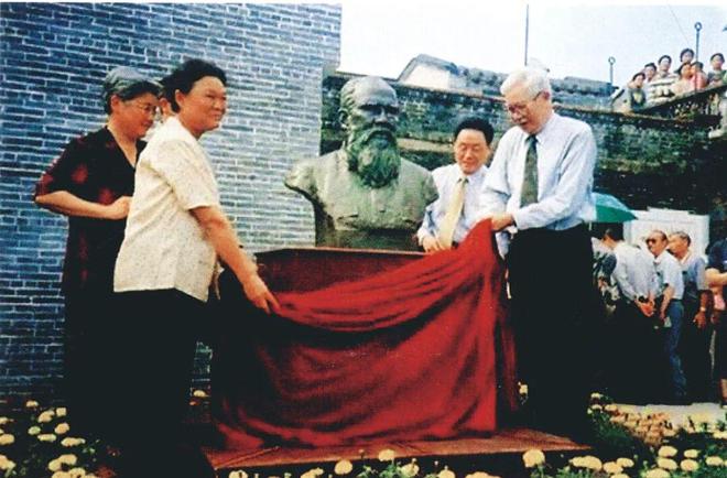 2003年,纪念司徒美堂先生诞辰135周年大会在广东开平举行。时任致公党主席罗豪才(右一)和司徒美堂孙女司徒月桂(左二)等为司徒美堂故居铜像揭幕。