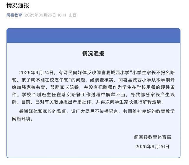 26日,闻喜县教体局就此事发布《情况通报》:经调查核实,闻喜县城西小学从本学期开始加强家校共育,鼓励家长陪餐,并没有把陪餐作为学生在学校用餐的硬性条件。学校个别班主任在落实陪餐工作过程中解释不当,导致部分家长产生误解。目前,已对有关教师提出严肃批评,并再次向学生家长进行解释澄清。