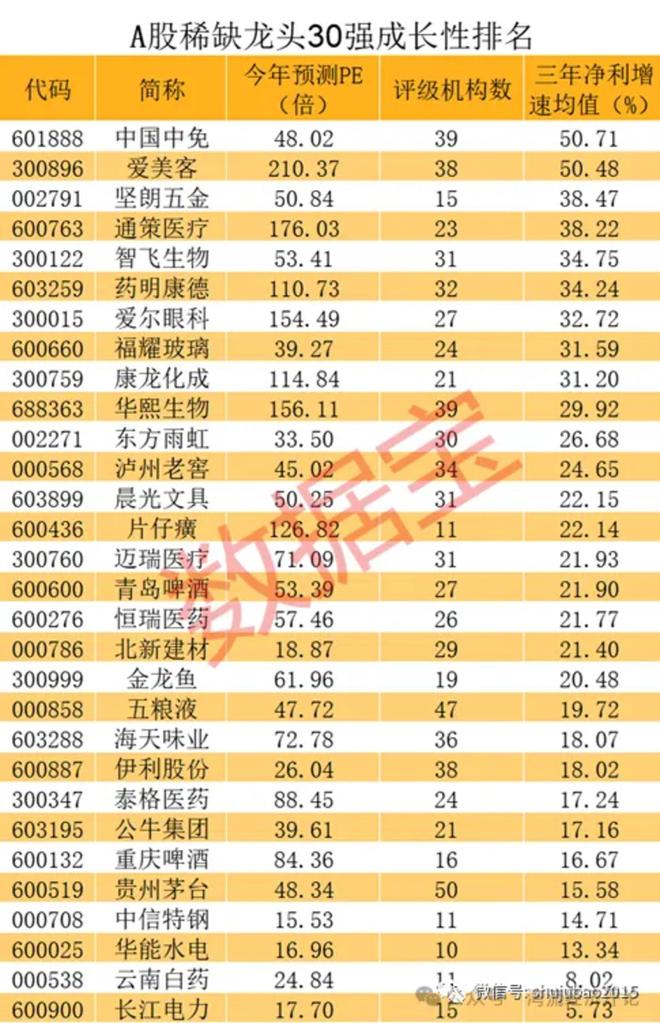 当时的A股稀缺龙头30强榜单,多是茅五泸,还有一众消费股。