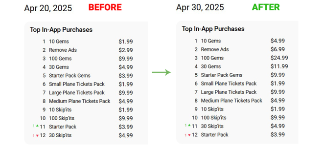 这种机制成为核心变现点:随着关卡变难,玩家更快消耗机票,被迫在「等待」或「付费」间做选择。2024年末到2025年初,机票礼包迅速登上iOS畅销IAP榜,成为核心收入驱动。