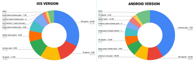 进一步看收入构成:iOS端以硬通货礼包(火箭升级用宝石)为主,大额机票包贡献7.1%,新版高价「去广告」IAP占11.7%。
