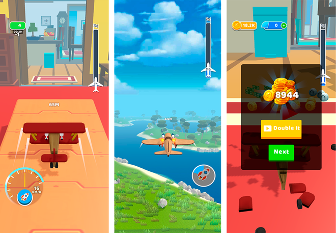 完成飞行后,玩家会获得金币,用于升级飞机,还有弹弓和金币倍增道具。由此形成「飞行—赚钱—升级」的循环。为避免单调,游戏还提供新飞机、新场景和新障碍。