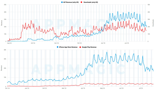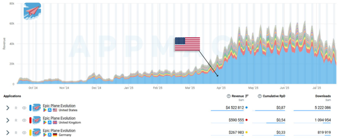 事实上,这款游戏长期徘徊在日均IAP收入1~1.2万美元的水平。但2025年4月起情况骤变:流水明显攀升,并主要由美国市场驱动。