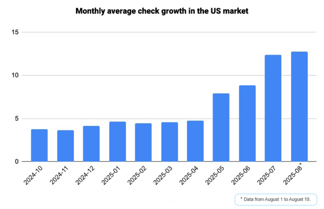 这些调整的效果,从美国区玩家每次消费的均价变化可见一斑:在四月份这个数字约为5美元,到七月份已超过13美元,短短数月时间内实现翻倍。