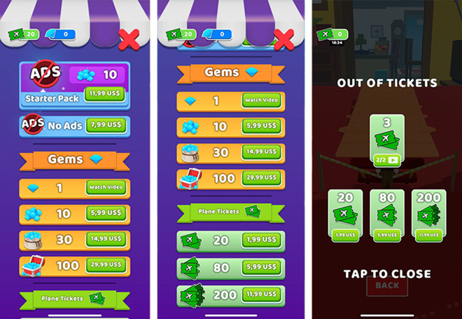 真正的转折点出现在第一关之后:游戏引入了「机票」机制,这是启动飞机所需的消耗品货币。玩家初始有20张机票(一次性),之后每20分钟自动恢复。如果玩家需要更多机票可以自行购买,或通过激励视频少量获取。即便如此,插屏广告依旧存在。