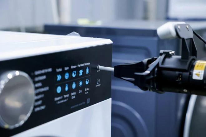 在工厂的另一侧,长期运行可靠性实验室,AI巡检机器人“玉兔”正在逐一对每一台洗衣机面板的运行状态进行检查。
