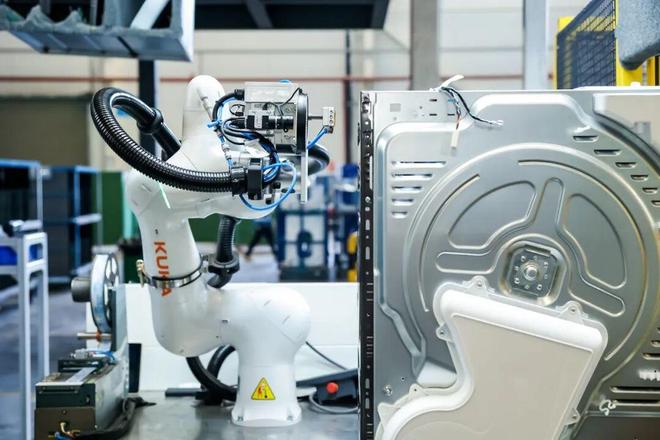 再如在干衣机后盖自动锁附工站的自动化线上,库卡最新的“iico协作机器人”是直接站在工人旁边或对面打螺丝,真正实现人机协同,不像以前需要安全围栏阻隔。