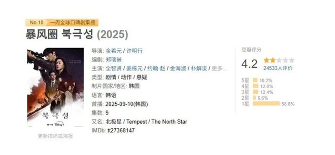 在舆论与商业的双重反噬下,《暴风圈》本身的口碑也彻底崩盘。其豆瓣评分从开分时的7.1一路暴跌至4.2,超过60%的观众打出一星评价。这部集结了顶级资源的“野心之作”,在中国市场遭遇了全面溃败。