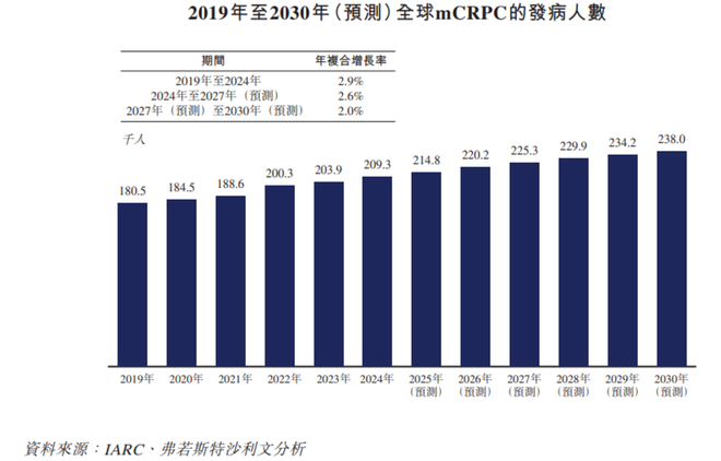 相较于其他常见癌症,上述两个癌症发病率较低。根据弗若斯特沙利文的资料,2024年全球CCA发病人数为29.0万人,mCRPC发病人数为20.9万人,预计2027年将分别增加至32.1万人、22.5万人。