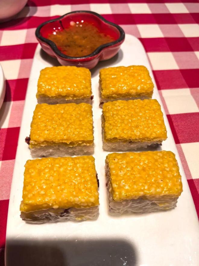 但今天的黄米凉糕,只是比常温稍微低温一些,并且里面的“米粒”粘性大但很松散,确实不像是冻过。