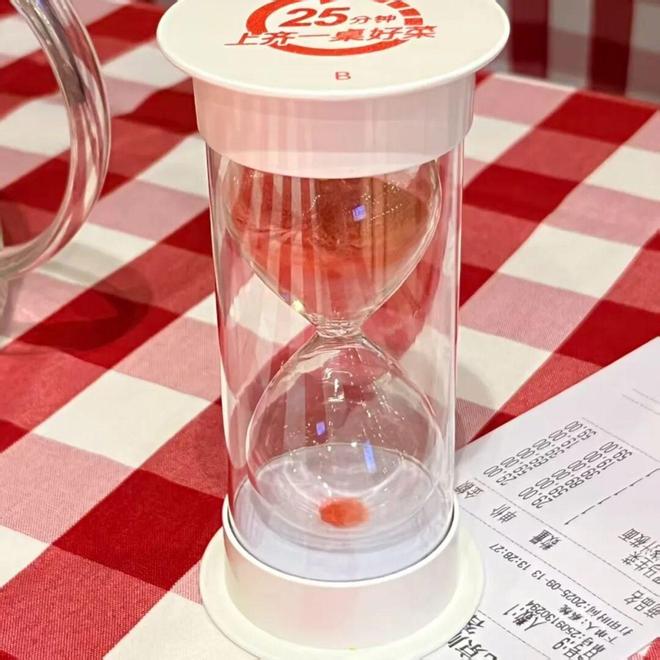 以前,西贝每个餐桌上都会放一个沙漏,上面写着“承诺25分钟出餐”。